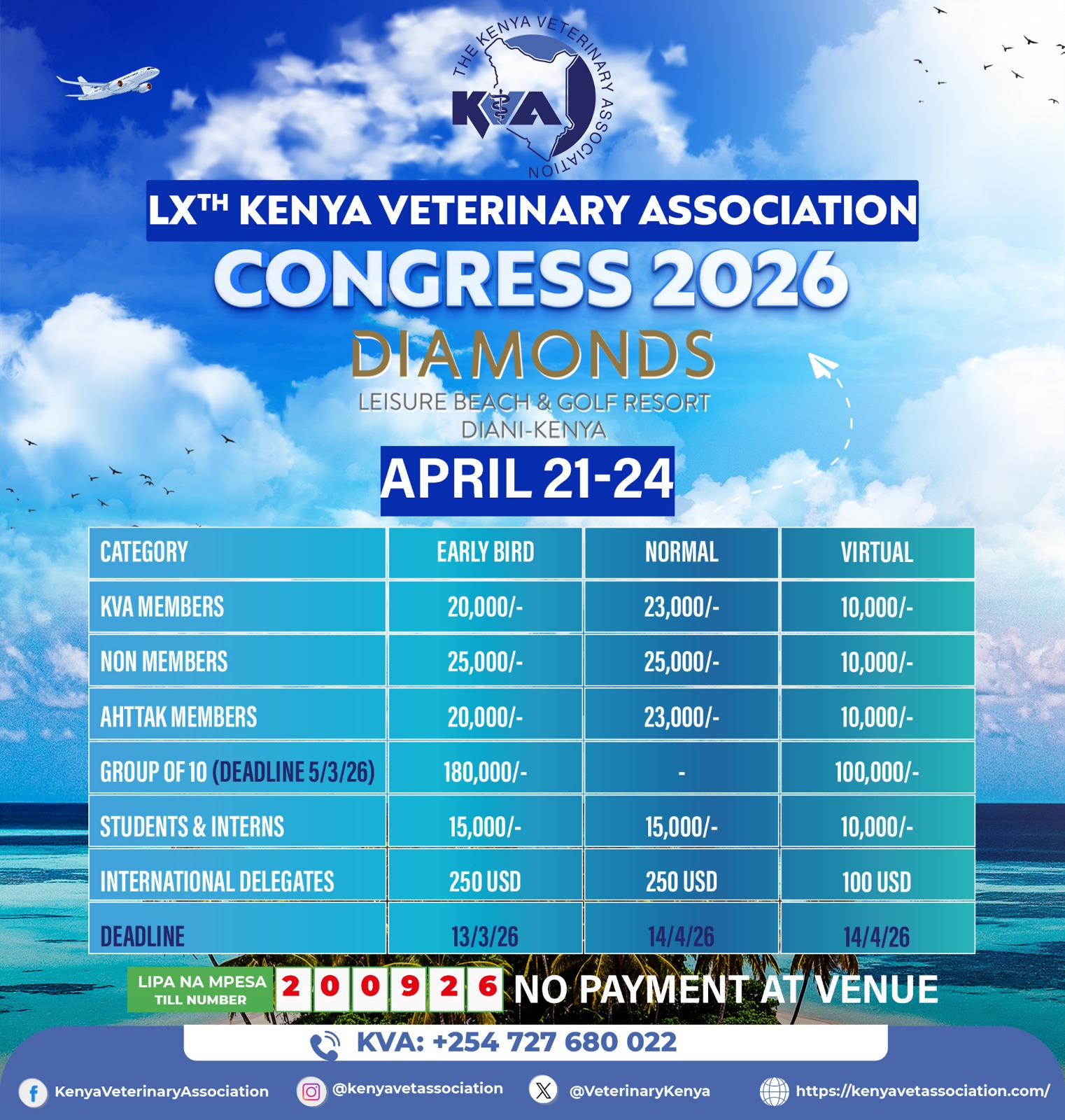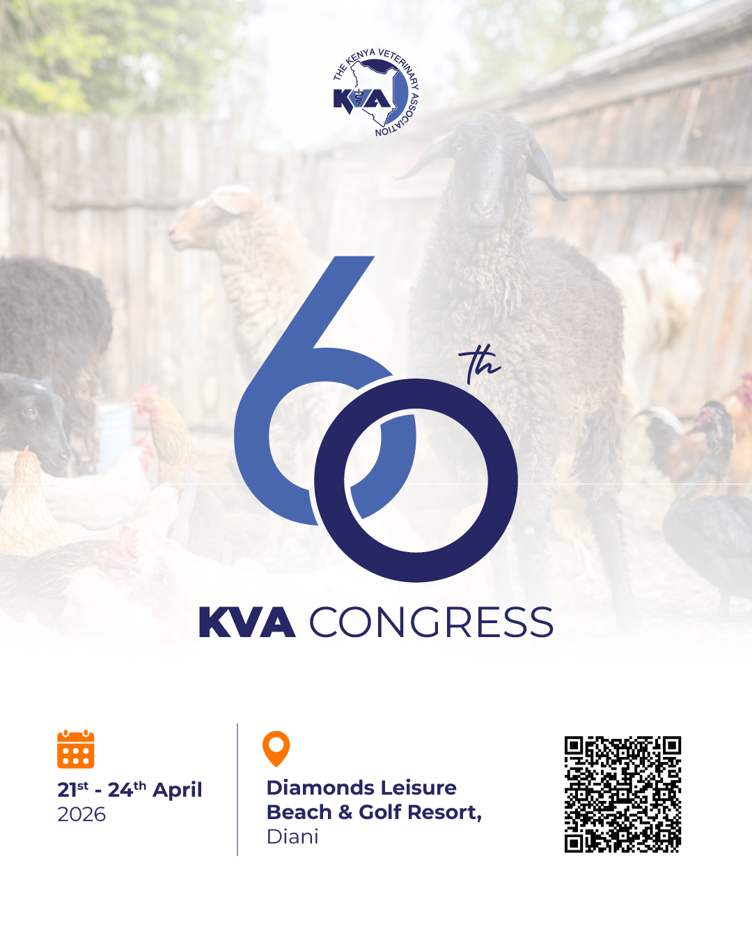 Join the Kenya Veterinary Association for its 60th Annual Congress, taking place April 21–24, 2026, at the Diamonds Leisure Beach & Golf Resort in Diani. This landmark event will feature four days of scientific sessions, masterclasses, and industry symposia exploring the latest in animal health, innovation, and One Health.