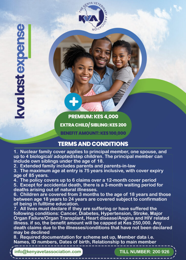 The Kenya Veterinary Association has negotiated unmatched rates for it’s members and family with the Kenya Commercial Bank under the last expense insurance cover. A specified amount is paid within 48 hours upon notification of death and presenting required documents of the insured persons.